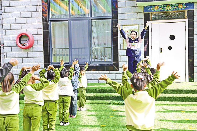 圖為楊攀帶領(lǐng)小朋友們做課間操。記者 潘璐 攝