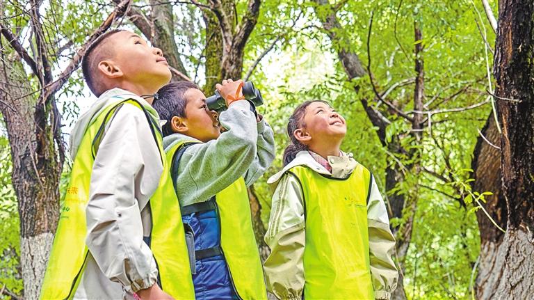 孩子們?cè)诶敐竦赜猛h(yuǎn)鏡觀察鳥(niǎo)類。記者 鹿麗娟 攝