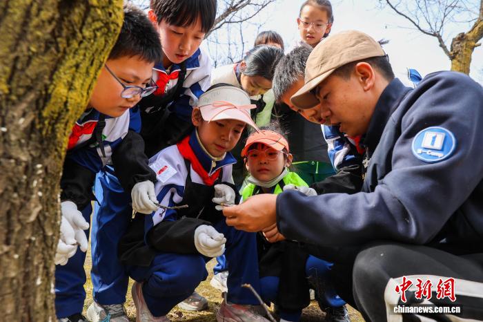 3月12日,青海西寧,“我在青海種下‘生命樹’”研學(xué)活動吸引青少年參與。活動通過科普宣講、樹木守護(hù)牌制作、林地清理等護(hù)綠實踐,增強(qiáng)生態(tài)意識,帶動全民愛綠護(hù)綠。圖為林草專業(yè)技術(shù)人員為學(xué)生科普植物種類。中新社記者 薛蒂 攝