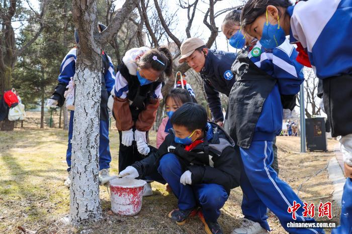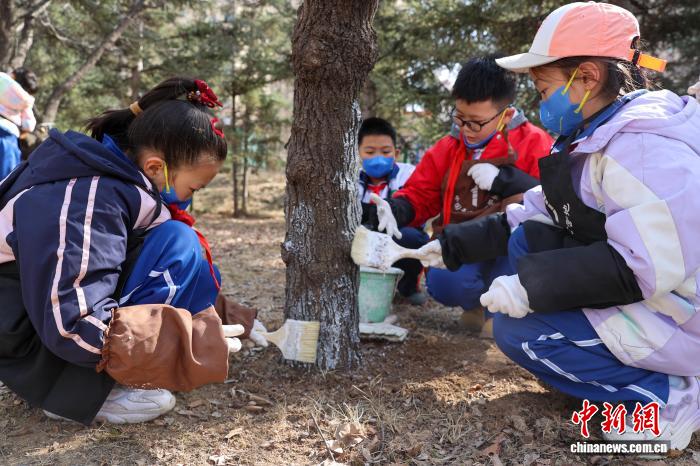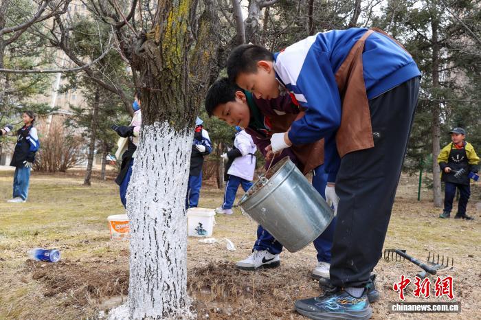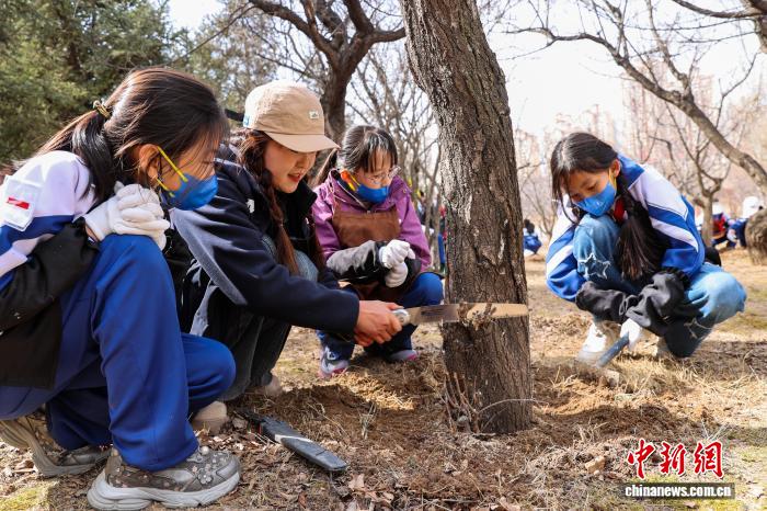 3月12日,青海西寧,“我在青海種下‘生命樹’”研學(xué)活動吸引青少年參與?;顒油ㄟ^科普宣講、樹木守護(hù)牌制作、林地清理等護(hù)綠實踐,增強(qiáng)生態(tài)意識,帶動全民愛綠護(hù)綠。圖為學(xué)生為樹干涂刷保護(hù)層。中新社記者 薛蒂 攝