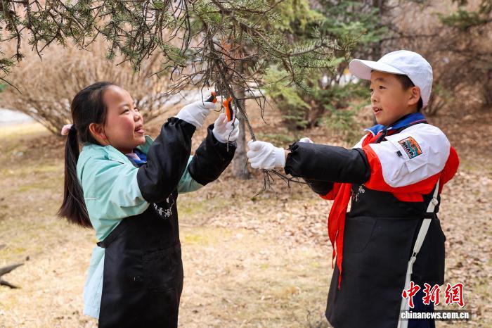 3月12日,青海西寧,“我在青海種下‘生命樹’”研學(xué)活動吸引青少年參與?;顒油ㄟ^科普宣講、樹木守護(hù)牌制作、林地清理等護(hù)綠實踐,增強(qiáng)生態(tài)意識,帶動全民愛綠護(hù)綠。圖為學(xué)生修剪枝干。中新社記者 薛蒂 攝