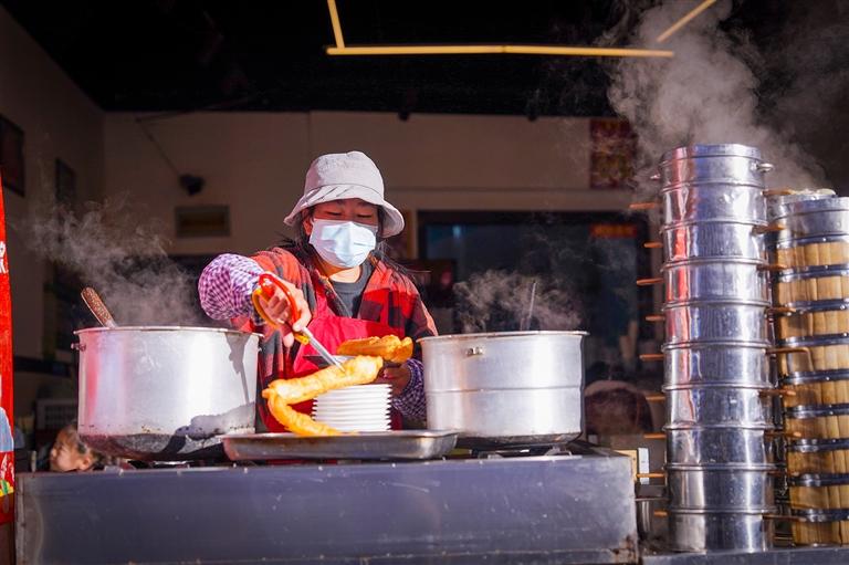 早上九點(diǎn),楊三姐的早餐店里生意正好,她一邊炸著韭菜盒子一邊忙碌地招呼著顧客?!皨輯?,幫我把油條剪成小段?!鄙习嘧鍎⑴縼?lái)到店里,買(mǎi)了一份豆?jié){油條。她說(shuō):“早上冷,我喜歡把油條泡進(jìn)滾燙的豆?jié){里吃,很暖和?!闭艋\揭開(kāi),一股股蒸騰的熱氣撲面而來(lái),包子面皮軟糯,內(nèi)里餡料飽滿(mǎn),趁熱咬上一口,濃郁的香味喚醒還在沉睡的味蕾。楊三姐告訴記者:“除了面點(diǎn),也有很多人愛(ài)點(diǎn)豌雜面等粉面,早上喝口熱湯才舒服?!?/p>
