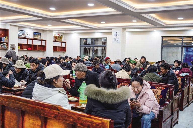 街頭的甜茶館里,時(shí)不時(shí)傳來(lái)歡聲笑語(yǔ),這里是拉薩冬日最溫暖的角落。在這里,人們臉上的笑容在氤氳的熱氣中若隱若現(xiàn),醇厚的茶香在小小的茶館內(nèi)裊裊升騰,酥油茶在長(zhǎng)柄壺中微微蕩漾,絲滑的茶水傾入食客們的木碗,泛起細(xì)膩的泡沫。此時(shí),阿佳端著一碗碗藏面上桌,質(zhì)樸的笑容驅(qū)散了冬日的寒意,溫暖著每一個(gè)過(guò)客的心房。