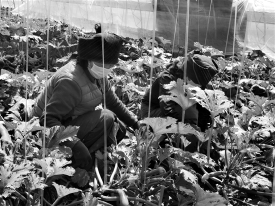 圖為致富帶頭人次仁曲珍公司的村民在大棚中采摘菜瓜。 拉薩融媒記者 范江英攝