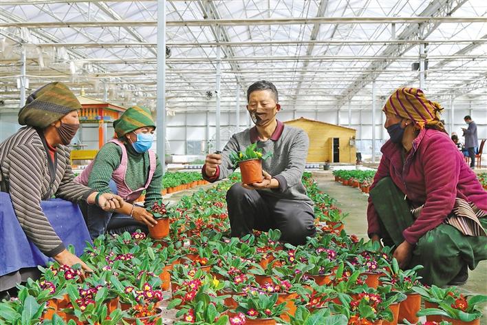 圖為在林周縣陽光溫室示范園區(qū),技術(shù)人員在指導(dǎo)村民種植花卉?!∮浾摺⊙虢稹z