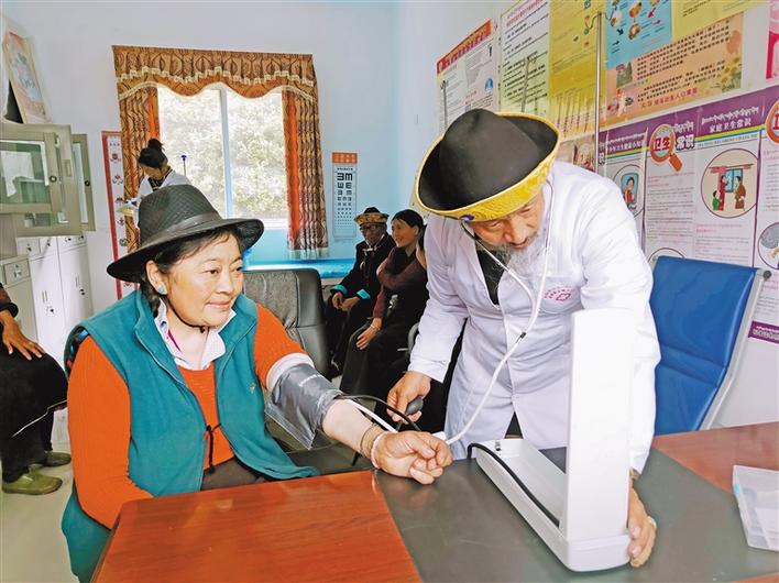 連日來,林芝米林縣各鄉(xiāng)鎮(zhèn)衛(wèi)生院醫(yī)務(wù)人員深入轄區(qū)村社開展醫(yī)療服務(wù)工作。 圖為米林縣羌納鄉(xiāng)衛(wèi)生院醫(yī)務(wù)人員在為村民進(jìn)行體檢。 記者 張猛 攝