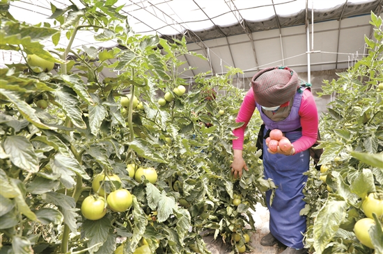 圖為在墨竹工卡縣現(xiàn)代農(nóng)業(yè)示范園溫室大棚里搬遷戶(hù)達(dá)瓦卓瑪正在摘西紅柿,到處都是一派豐收的景象。 拉薩融媒記者 貢嘎來(lái)松 攝