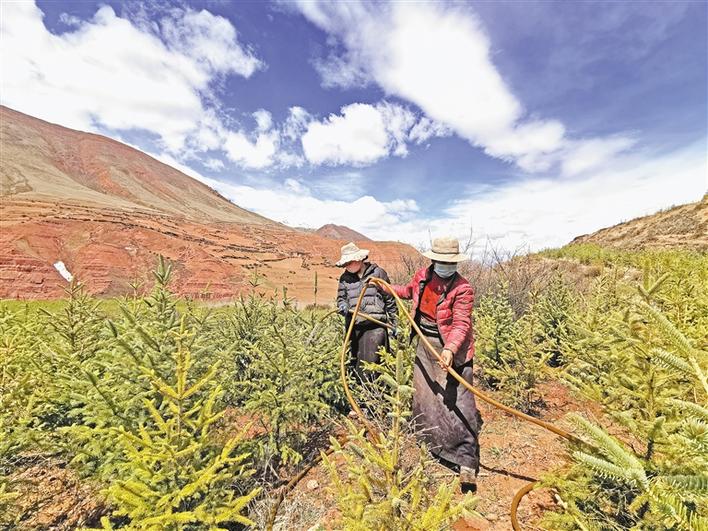 西藏昌都市丁青縣覺(jué)恩鄉(xiāng)絨通村苗木種植項(xiàng)目總投資2000萬(wàn)元,采取“公司+基地+農(nóng)戶”的運(yùn)作模式。2018年底,基地開(kāi)工建設(shè),93戶農(nóng)戶以每畝每年1000元的價(jià)格參與500畝的土地流轉(zhuǎn),項(xiàng)目實(shí)施階段共計(jì)880人次的貧困戶參與了務(wù)工。至2019年6月,已成功栽下云杉、昌都楊、柳樹(shù)、榆樹(shù)4個(gè)品種,共計(jì)97萬(wàn)株樹(shù)苗。目前,在基地長(zhǎng)期務(wù)工的村民有8名,年收入近2萬(wàn)元。