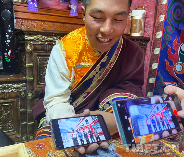 圖為西藏自治區(qū)阿里地區(qū)改則縣圓夢新居易地扶貧搬遷點(diǎn)居民扎西頓珠在向記者展示自己的抖音視頻 攝影:王媛媛