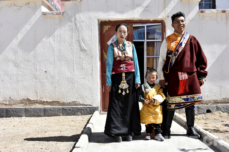 圖為西藏自治區(qū)阿里地區(qū)改則縣圓夢新居易地扶貧搬遷點(diǎn)居民扎西頓珠和妻子以及小兒子在家門前合影 攝影:王媛媛