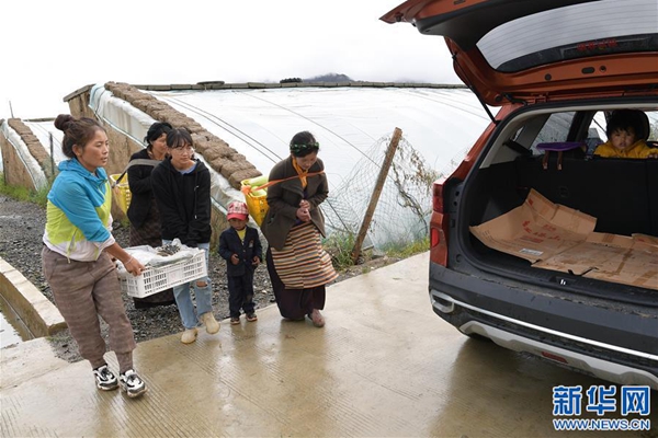 格桑旺姆(左三)和姐姐德吉卓瑪(左一)帶領(lǐng)雇傭的殘障村民巴珍(右一)搬運大棚出產(chǎn)的新鮮蔬菜(8月3日攝)。