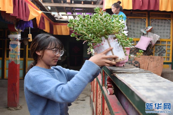 格桑旺姆用花草裝飾自己家(8月3日攝)。
