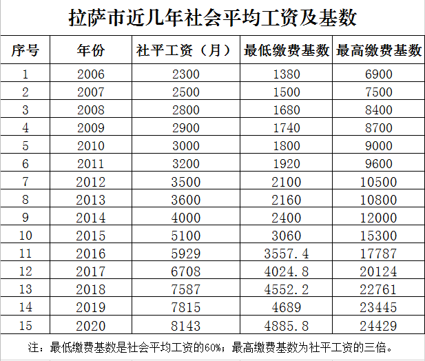 根據(jù)西藏自治區(qū)人社廳、西藏自治區(qū)財(cái)政廳、西藏自治區(qū)統(tǒng)計(jì)局《關(guān)于發(fā)布2020年上年度全區(qū)職工月平均工資的通知》(藏人社發(fā)〔2020〕82號(hào))精神,2020年社會(huì)平均工資為8143元/月,新的繳費(fèi)基數(shù)上下限及繳費(fèi)標(biāo)準(zhǔn)從2020年1月1日起執(zhí)行。