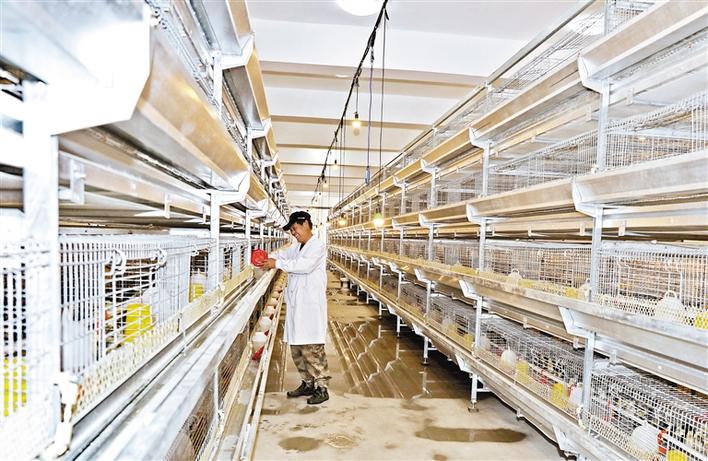 圖為拉孜縣曲瑪鄉(xiāng)拉孜拉貴藏雞養(yǎng)殖孵化保種有限責(zé)任公司的員工給藏雞投食。記者 次旺 唐斌 攝