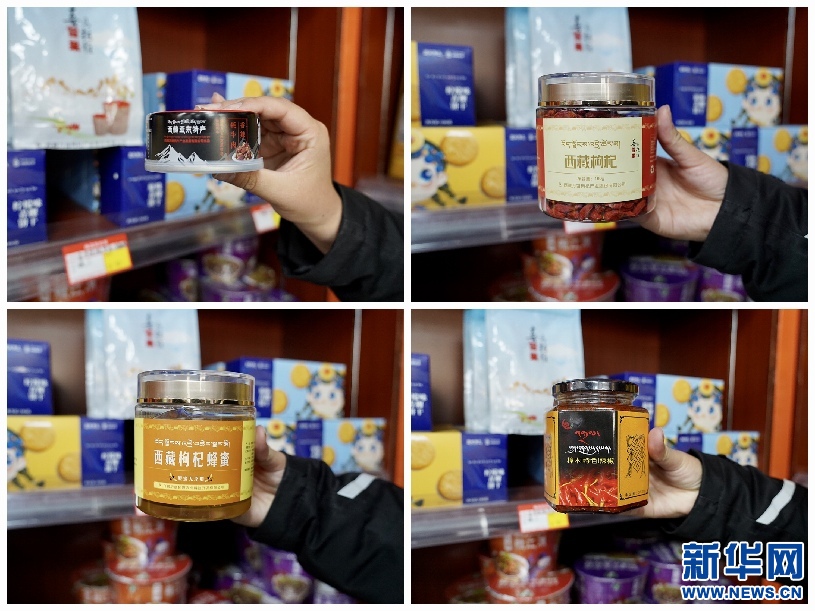 拼版照片:扶貧專柜內(nèi)擺放的日喀則特色產(chǎn)品(10月24日攝)。新華網(wǎng) 達(dá)珍 攝