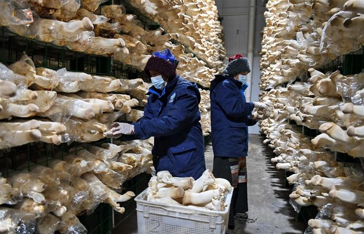 圖為生物科技示范園區(qū)內,工作人員在采摘杏鮑菇。記者 唐斌 次旺 攝
