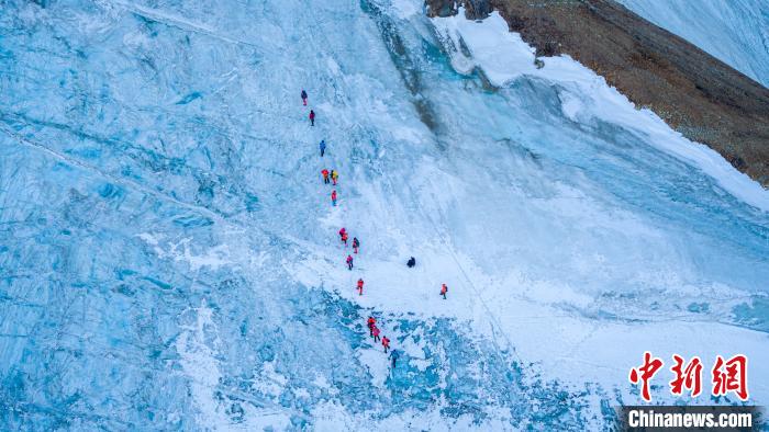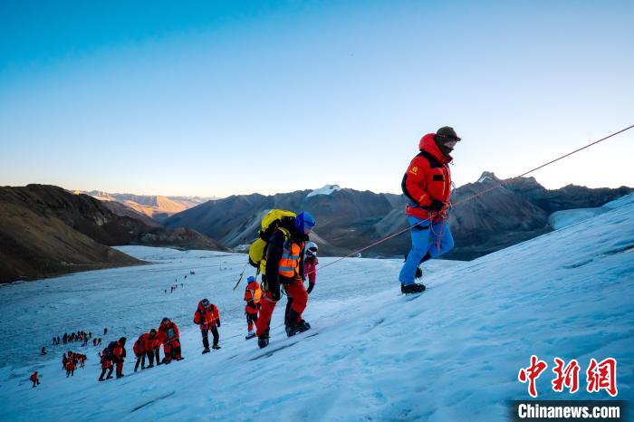 圖為第三極攀登者2020中國(guó)企業(yè)家冰川挑戰(zhàn)賽參賽者在登山途中。 當(dāng)雄縣委宣傳部供圖