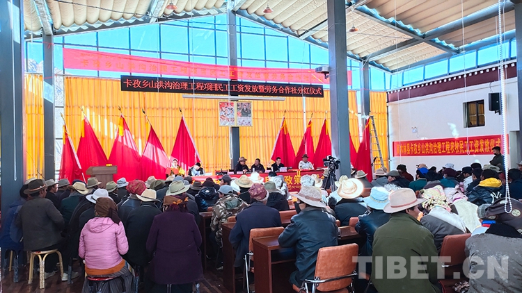 圖為西藏自治區(qū)日喀則市南木林縣卡孜鄉(xiāng)山洪溝治理工程項(xiàng)目民工工資發(fā)放暨勞務(wù)合作社分紅儀式現(xiàn)場