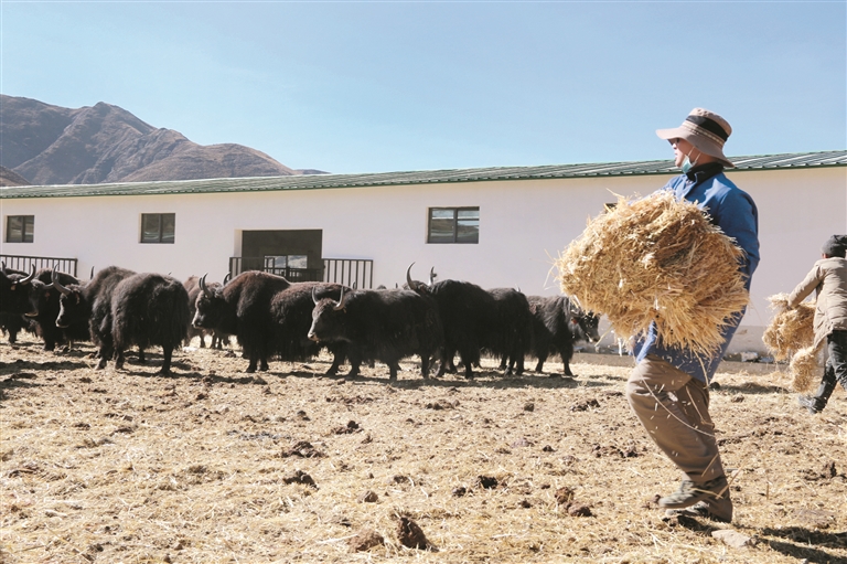 圖為在林周縣格桑塘現(xiàn)代農(nóng)牧產(chǎn)業(yè)示范園牦牛養(yǎng)殖基地,工作人員在給牦牛喂飼草料。 拉薩融媒記者 龍俊霖?cái)z