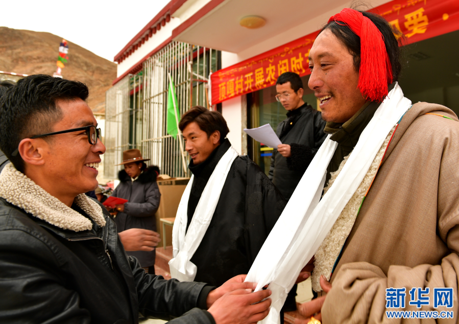 西藏拉薩市堆龍德慶區(qū)德慶鄉(xiāng)頂嘎村駐村第一書記扎西達杰(左)為參加文娛活動的獲獎村民頒獎并佩戴哈達(2019年2月28日攝)。新華社記者 張汝鋒 攝