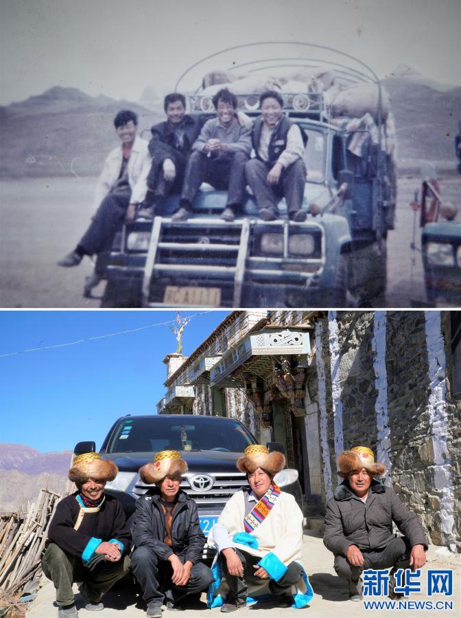 拼版照片:上圖:1994年,24歲的強巴(右二)和他的三個兄弟在西藏阿里地區(qū)跑運輸時,在自己購買的“東風(fēng)”牌運輸車前合影(強巴提供)。(新華社發(fā))