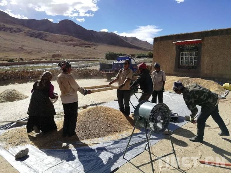 村民們進(jìn)行青稞脫粒,喜獲豐收