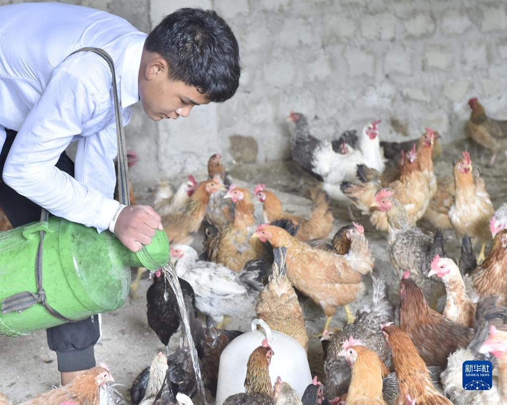 9月15日,西藏定結縣陳塘鎮(zhèn)養(yǎng)雞場工作人員扎旺給藏雞喂水。新華社發(fā)(索朗羅布 攝)