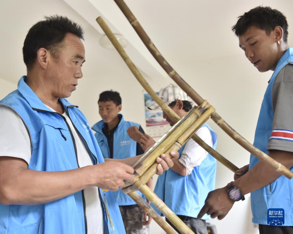9月15日,西藏定結縣陳塘鎮(zhèn)農民、夏爾巴竹器手工藝傳承人加布(左一)指導村民編制竹器。新華社發(fā)(索朗羅布 攝)