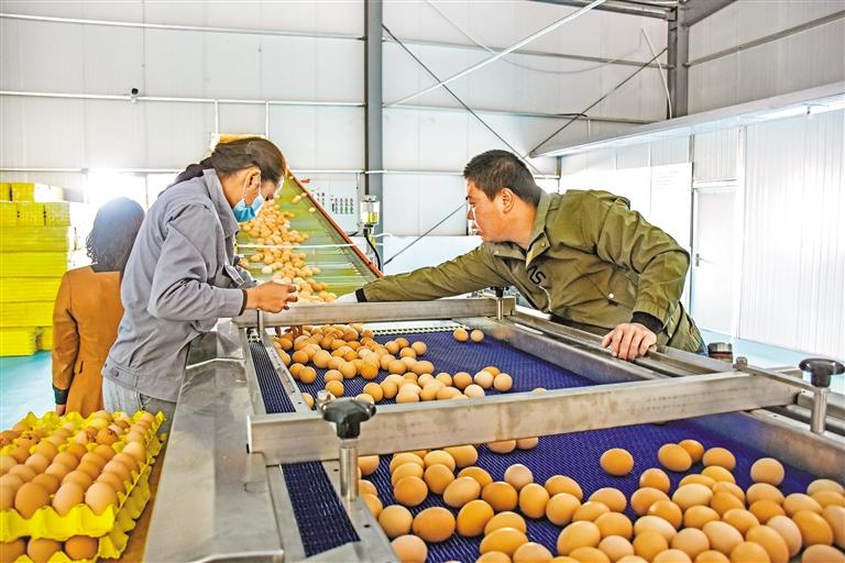圖為就業(yè)群眾和技術員在西藏宏農(nóng)百萬羽全智能化藏雞產(chǎn)業(yè)園的流水線上篩檢成品雞蛋。 記者 劉楓 攝