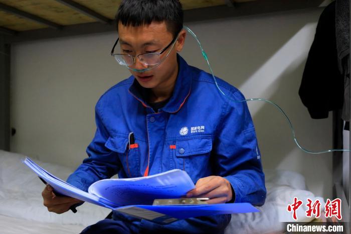 圖為付新程完成當(dāng)日的檢修工作,在宿舍內(nèi)一邊吸氧氣,一邊研究工作方案?!∶犀| 攝