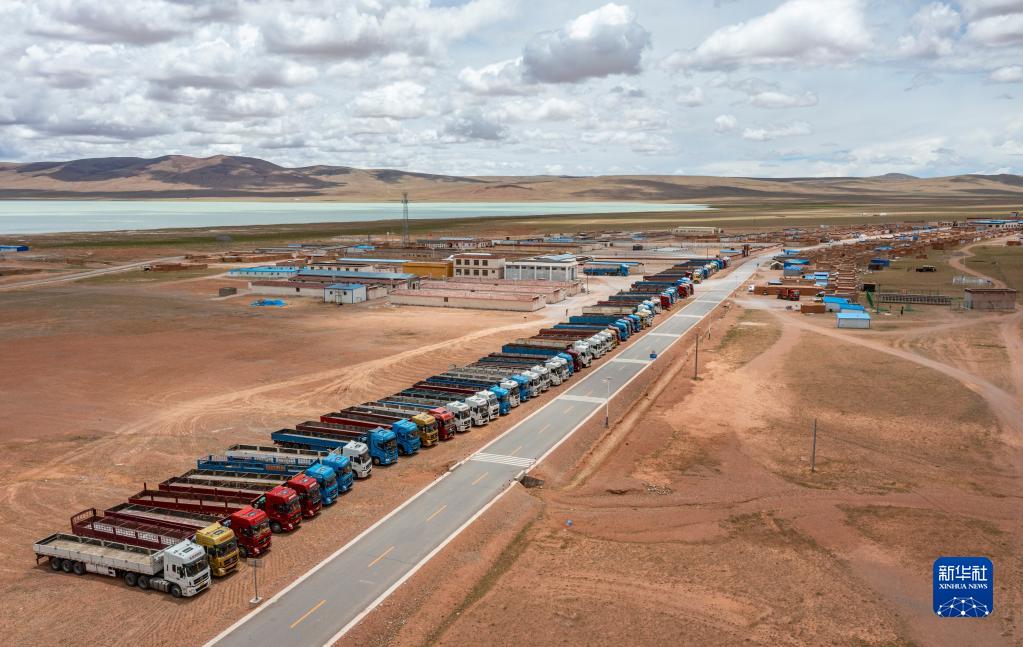 在雙湖縣多瑪鄉(xiāng)拍攝的負(fù)責(zé)運(yùn)送搬遷群眾家具的貨車(chē)(7月12日攝,無(wú)人機(jī)照片)。新華社記者 孫非 攝