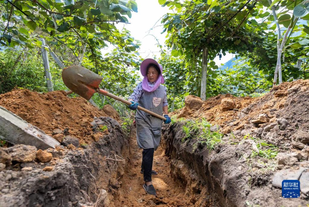 村民在獼猴桃基地勞作。新華社記者周荻瀟 攝