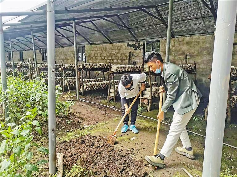 圖為莎列村團(tuán)支部書記米瑪(右)在溫室翻地栽苗。