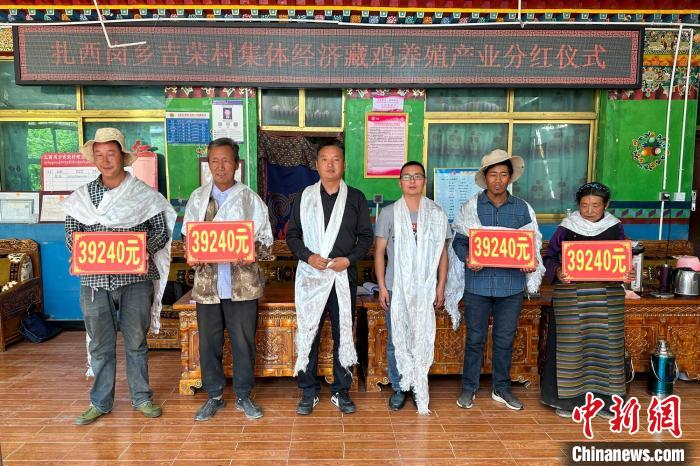 圖為分紅活動(dòng)現(xiàn)場(chǎng),吉榮村四個(gè)組代表領(lǐng)取藏雞養(yǎng)殖分紅。西藏自治區(qū)科技廳駐吉榮村工作隊(duì) 供圖