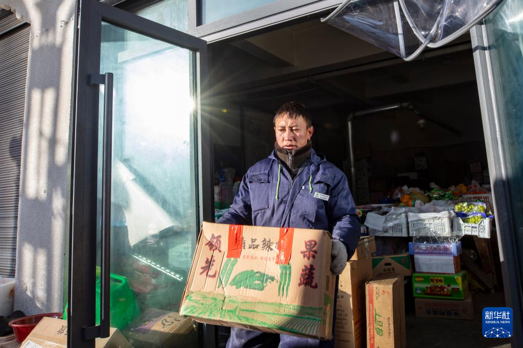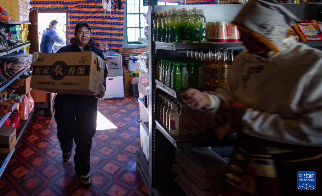 申扎縣供銷合作社的配送員巴拉在馬躍鄉(xiāng)貝嘎四村偏遠鄉(xiāng)鎮(zhèn)果蔬配送試點項目直銷點,幫店主西熱加措搬運新鮮果蔬(1月5日攝)。新華社記者 姜帆 攝