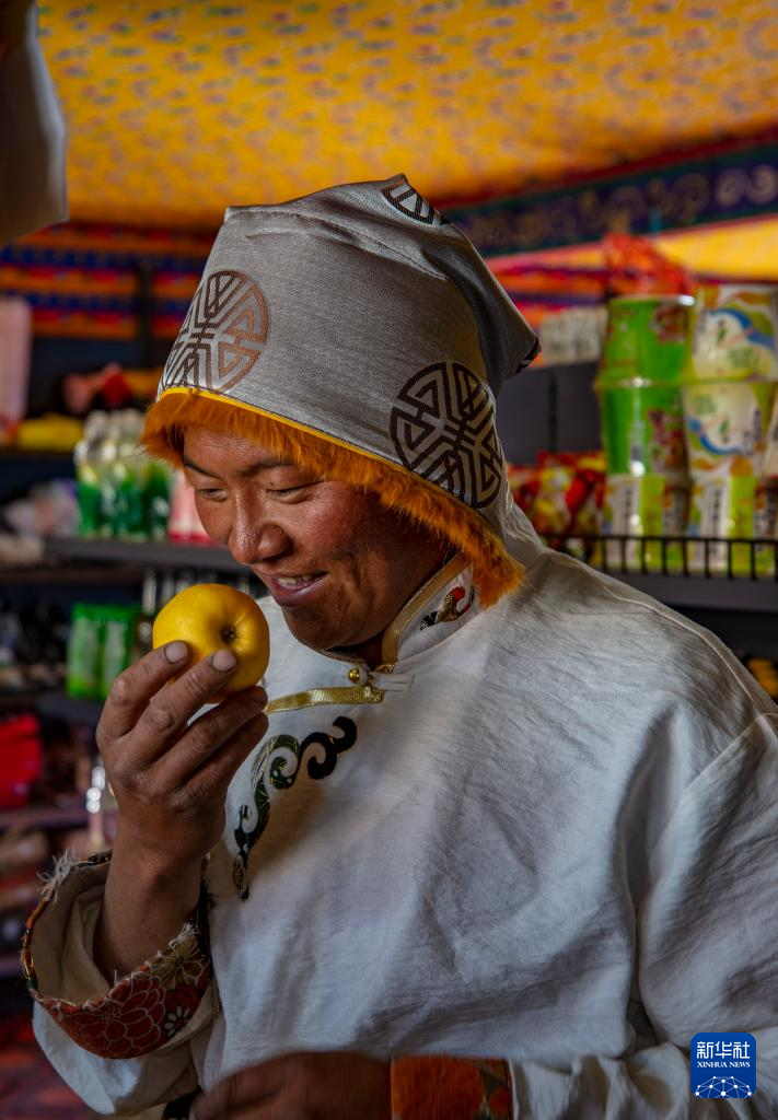 申扎縣馬躍鄉(xiāng)貝嘎四村偏遠鄉(xiāng)鎮(zhèn)果蔬配送試點項目直銷點店主西熱加措拿起供銷合作社配送來的水果(1月5日攝)。新華社記者 姜帆 攝