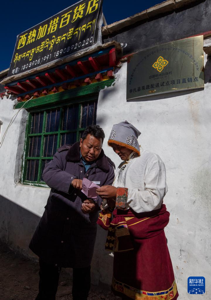 申扎縣供銷合作社的配送負責人吳瓦(左)與馬躍鄉(xiāng)貝嘎四村偏遠鄉(xiāng)鎮(zhèn)果蔬配送試點項目直銷點店主西熱加措核對配送清單(1月5日攝)。新華社記者 姜帆 攝