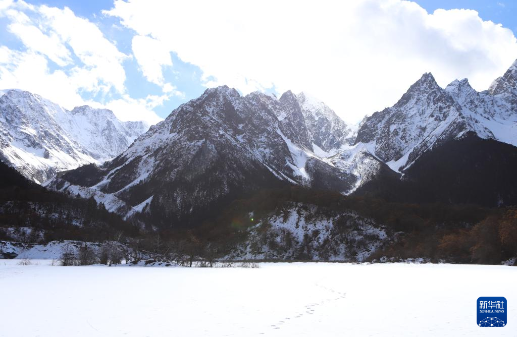 梅里雪山群峰和覆蓋白雪的冰湖(1月5日攝)。新華社記者關(guān)明輝 攝
