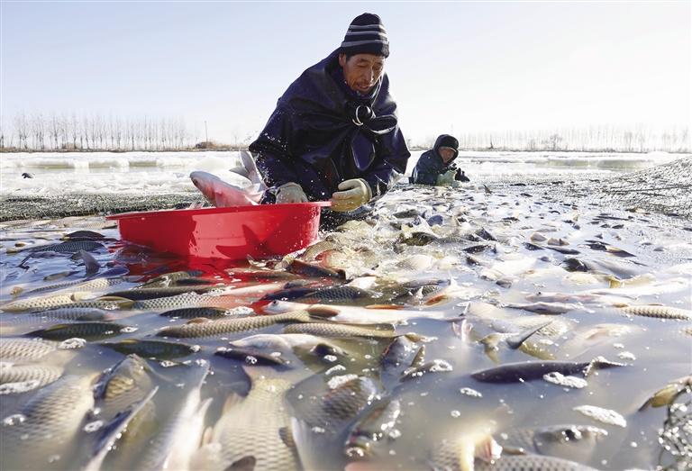 河北省唐山市豐南區(qū)老鋪村的淡水魚養(yǎng)殖戶在魚塘捕魚。 文圖均來自新華社