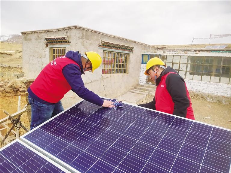 “次桑在家嗎?我們過來看一下你們新年準備得怎么樣了?”聽到劉光輝的呼喚,孩子們都跑出來迎接這位“小黃帽”叔叔。劉光輝和羅桑歐珠進屋放下年貨,顧不上休息,立馬搭梯子爬上次桑家的房頂,用抹布拂去光伏電板上的塵土,拿出工具仔細檢查電源和光伏設(shè)備是否有損壞?!按紊<矣玫氖俏覀兊牡谝淮柲芄夥姲?,這個電板要經(jīng)常擦拭,保持表面干凈,發(fā)電效率會更好?!眲⒐廨x說。檢修完光伏電板后,劉光輝和羅桑歐珠又回到屋內(nèi)檢查次桑家的電路線路,對插排插座等可能存在安全隱患的地方進行認真排查。確保沒有問題后,兩人將之前昏暗的燈泡全部換成了最新的節(jié)能燈泡,整個屋子一下亮堂了起來。