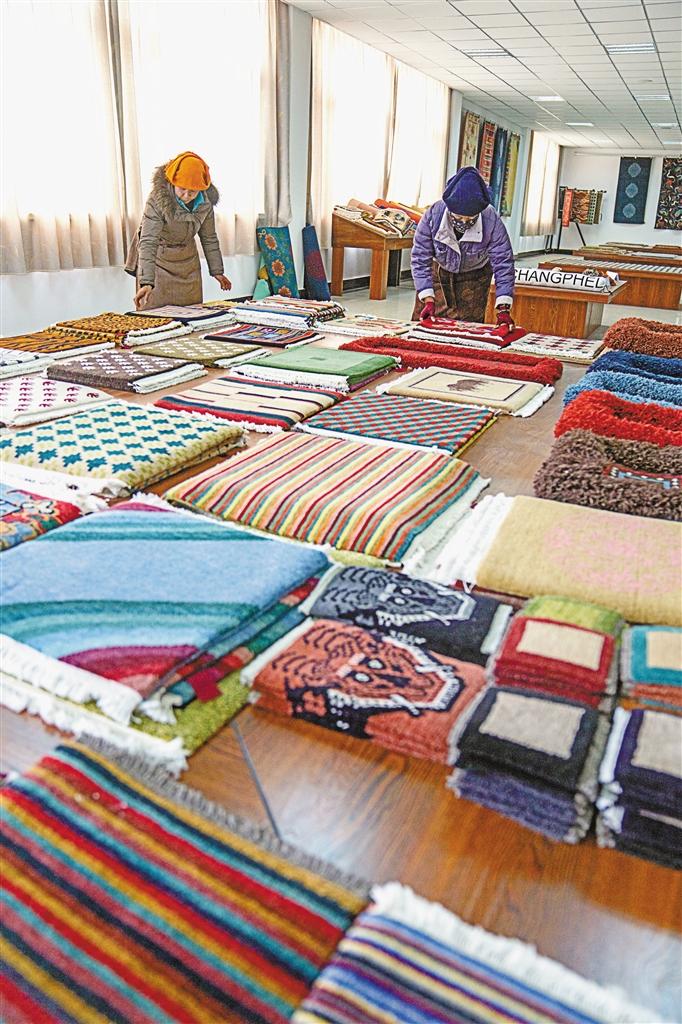 群眾在整理編織好的藏毯(2月22日攝)。新華社記者 旦增尼瑪曲珠 攝