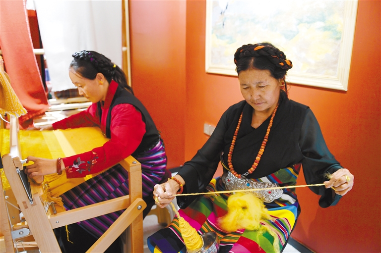 圖為“阿佳格桑工坊”的阿佳們在制作氆氌。記者 王敏 攝