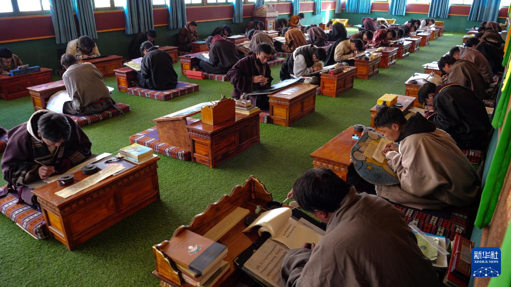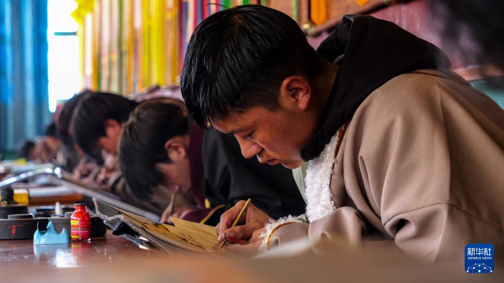 11月22日,昌都市丁青縣擁忠文化藝術(shù)中心非遺扶貧就業(yè)工坊學(xué)員在練習(xí)藏文書法。新華社記者 普布次仁 攝