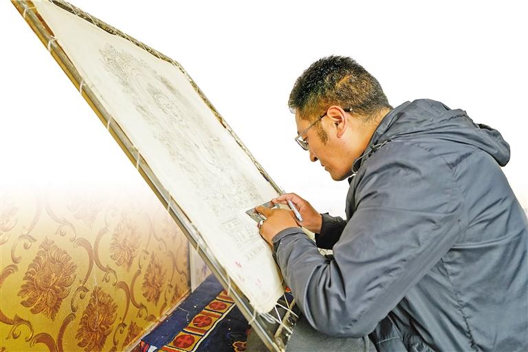 圖為洛隆縣康布農(nóng)牧民文化手工藝專(zhuān)業(yè)合作社的畫(huà)師在繪制唐卡。記者 次仁平措 攝