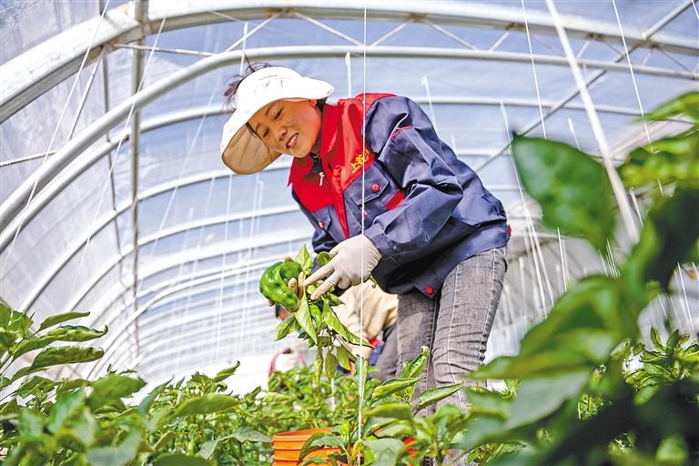 工作人員在采摘辣椒。記者 阿旺尼瑪 攝