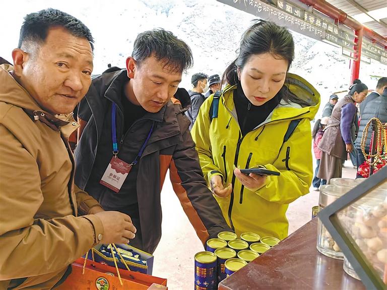 圖為嘉黎縣尼屋鄉(xiāng)桃花節(jié)期間,游客爭相購買特色農(nóng)產(chǎn)品。記者 趙書彬 攝