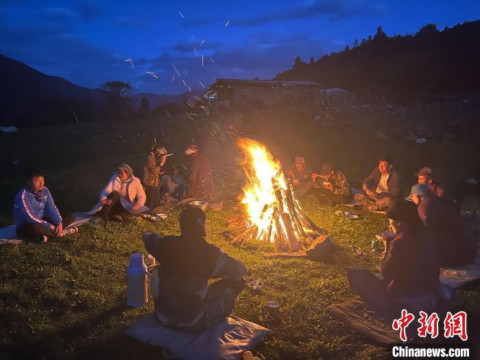 夜幕中,篝火噼啪燃燒。十多位男女老少團(tuán)團(tuán)圍坐,火光映紅了每個(gè)人的臉龐。酒酣耳熱,情深意濃之際,藏族、納西族、普米族的民歌相繼響起。