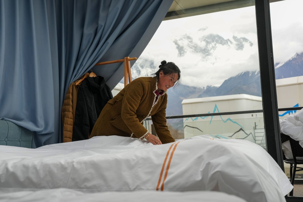 2025年4月4日,林芝索松村一家民宿的服務(wù)員在整理房間。近年來(lái),林芝在生態(tài)保護(hù)與旅游發(fā)展的良性互動(dòng)中,探索出“賞花+民宿”“賞花+文創(chuàng)”等復(fù)合經(jīng)營(yíng)模式。2025年4月4日至4月6日期間,林芝市累計(jì)接待游客20.86萬(wàn)人次,同比增長(zhǎng)20.58%;實(shí)現(xiàn)旅游收入1.5億元,同比增長(zhǎng)37.62%。