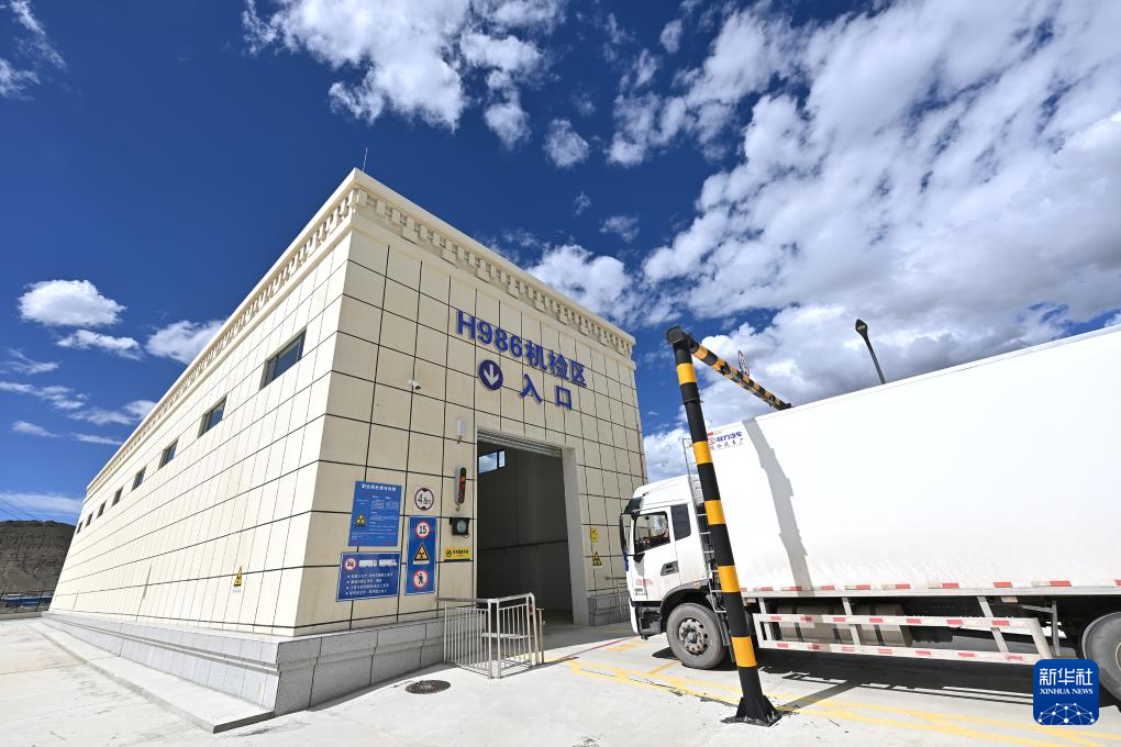 7月16日,貨車通過(guò)日喀則國(guó)際陸地港出口貨物查驗(yàn)場(chǎng)卡口。新華社記者 李鑫 攝