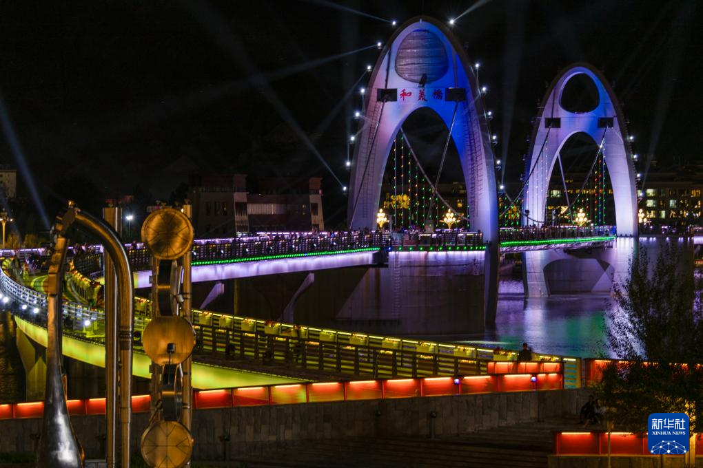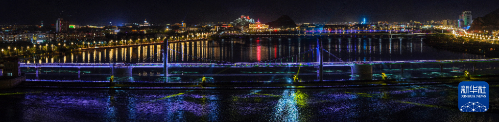 這是7月30日拍攝的拉薩河夜景,由近及遠(yuǎn)分別是和美橋、柳梧大橋和連心橋(無人機拼接照片)。新華社記者 姜帆 攝